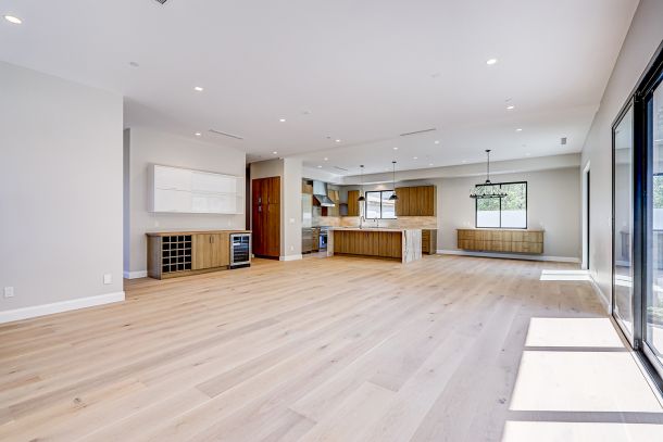 At the center of the home, the kitchen is crafted for both style and function. Stainless steel appliances, a six-burner range, and a generous island with utility sink provide the tools and space for effortless everyday cooking or weekend entertaining. Smart storage solutions and timeless finishes elevate the experience, while French oak floors extend gracefully through open living areas. A wall of sliding glass doors connects the indoors to a sunlit patio, ideal for dining under the coastal sky. A contemporary fireplace, built-in beverage center, and pre-installed solar panels underscore both comfort and sustainability.