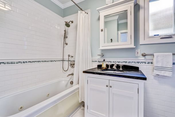 Spa-inspired bathroom with marble flooring, jetted soaking tub, and mosaic glass inlays.