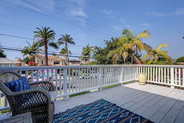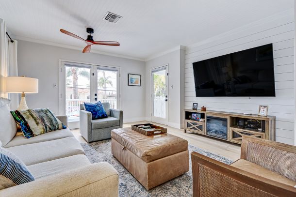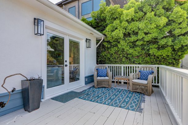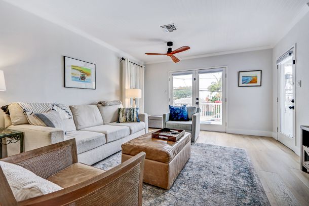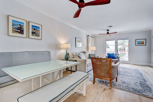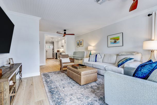 The light-filled living room welcomes you with a glass front door and soft coastal textures. Beadboard ceilings and a white slatboard accent wall bring subtle dimension, while refined ceiling fans keep the space airy on mild days. Double French doors open to a spacious deck perched above the street, where ocean breezes drift through and sunsets stretch across the horizon. It’s the perfect spot for morning coffee or an evening glass of wine, all framed by the rhythmic calm of coastal life