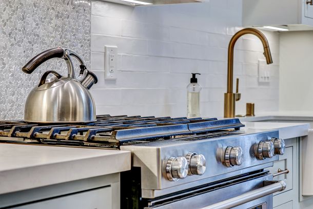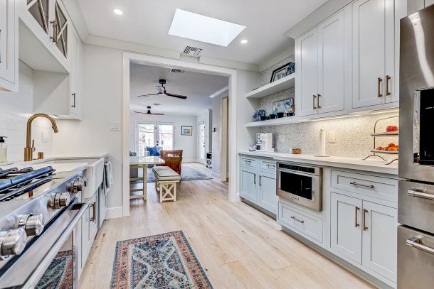 Inside, wide-plank oak floors flow through a thoughtfully open layout, drawing the eye to a stunning kitchen that’s both refined and welcoming. Quartz countertops, white shaker cabinetry above, and soft blue-green tones below create a harmonious palette complemented by brushed gold hardware. A farmhouse sink anchors the space, paired with a luminous marble-and-mosaic backsplash and skylight that fills the room with sunshine. High-end KitchenAid appliances, a beverage center, floating shelves, and a built-in dining nook complete the picture of functional elegance.