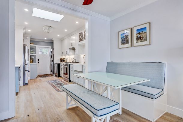 The kitchen balances form and function with effortless style. Quartz countertops and two-tone shaker cabinetry set a fresh, modern tone, brightened by natural light streaming through the skylight above. Every detail—from the farmhouse sink to the built-in banquette—feels intentional and timeless, blending everyday comfort with an understated elegance.
