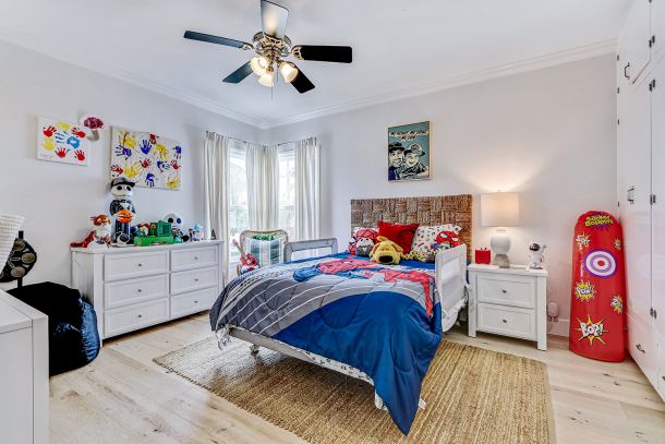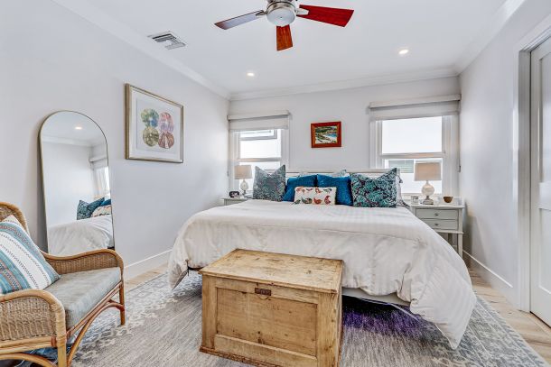 Both bedrooms echo the home’s crisp coastal aesthetic, framed with crown molding, wide baseboards, and dual-pane windows that bring in soft natural light. The primary bedroom embraces clean lines and calm tones, while the west bedroom—detailed with crown molding—offers charm and comfort with a view toward the afternoon sun. The bathroom is elegantly finished with marble floors, a jetted soaking tub, and mosaic glass inlays that add a touch of artistry throughout the space