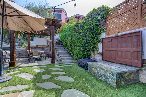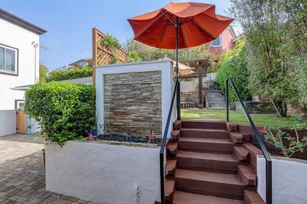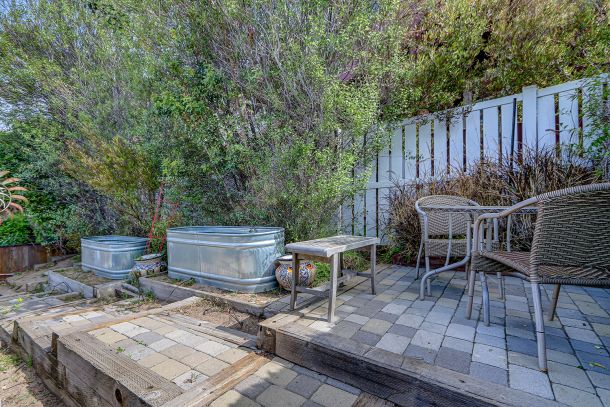 Step through the kitchen door to a backyard designed for coastal entertaining. A custom pergola—complete with a heater and retractable screens. The outdoor kitchen, which features a stainless-steel BBQ, polished stone surfaces, and plenty of counter space. The tiered backyard layout unfolds across low-maintenance turf strategically placed steppingstones and raised planting beds including a drip system. A built-in fire pit, its flame dancing through shimmering glass rocks, becomes the natural gathering point on cool beach evenings. Nearby, a tranquil stone water feature adds a gentle soundtrack just beyond the kitchen door, blending beauty and serenity.