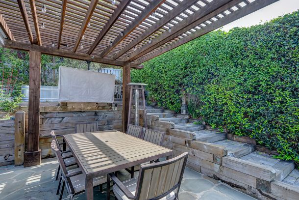 Beyond the kitchen door, the backyard unfolds as a private haven designed for relaxation and connection. A custom pergola with retractable screens and a built-in heater extends the living space, while the outdoor kitchen, fire pit, and water feature invite gatherings from day to night. Low-maintenance turf, tiered planting beds, and softly lit pathways complete an environment where beauty and function live effortlessly side by side.